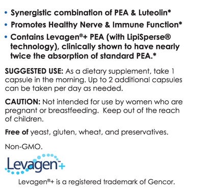 When combined, PEA and luteolin show enhanced anti-inflammatory, anti-oxidant and neuroprotective properties. Coadministration of PEA with luteolin has been shown to decrease mast cell activation significantly more than PEA or luteolin alone. This combination has been shown to reduce pro-inflammatory cytokines (TNF-alpha, IL-1 beta, IL-6) and chemokines (MIP-1 alpha, MIP-2) significantly more than PEA or luteolin alone. Additionally, PEA with luteolin was shown to reduce oxidative and nitrosative damage more effectively than PEA or luteolin alone. (Impellizzeri 2018)