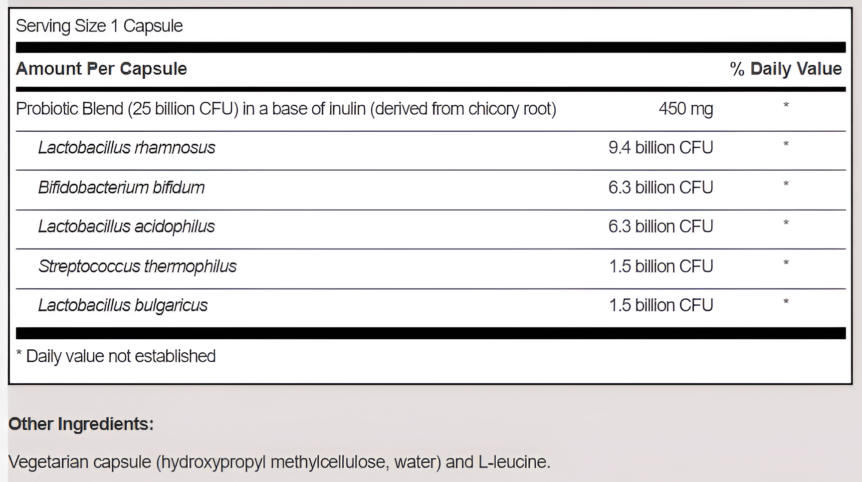 - Provides both colonizing probiotic species and two transient species that compete with unfriendly bacteria and yeast