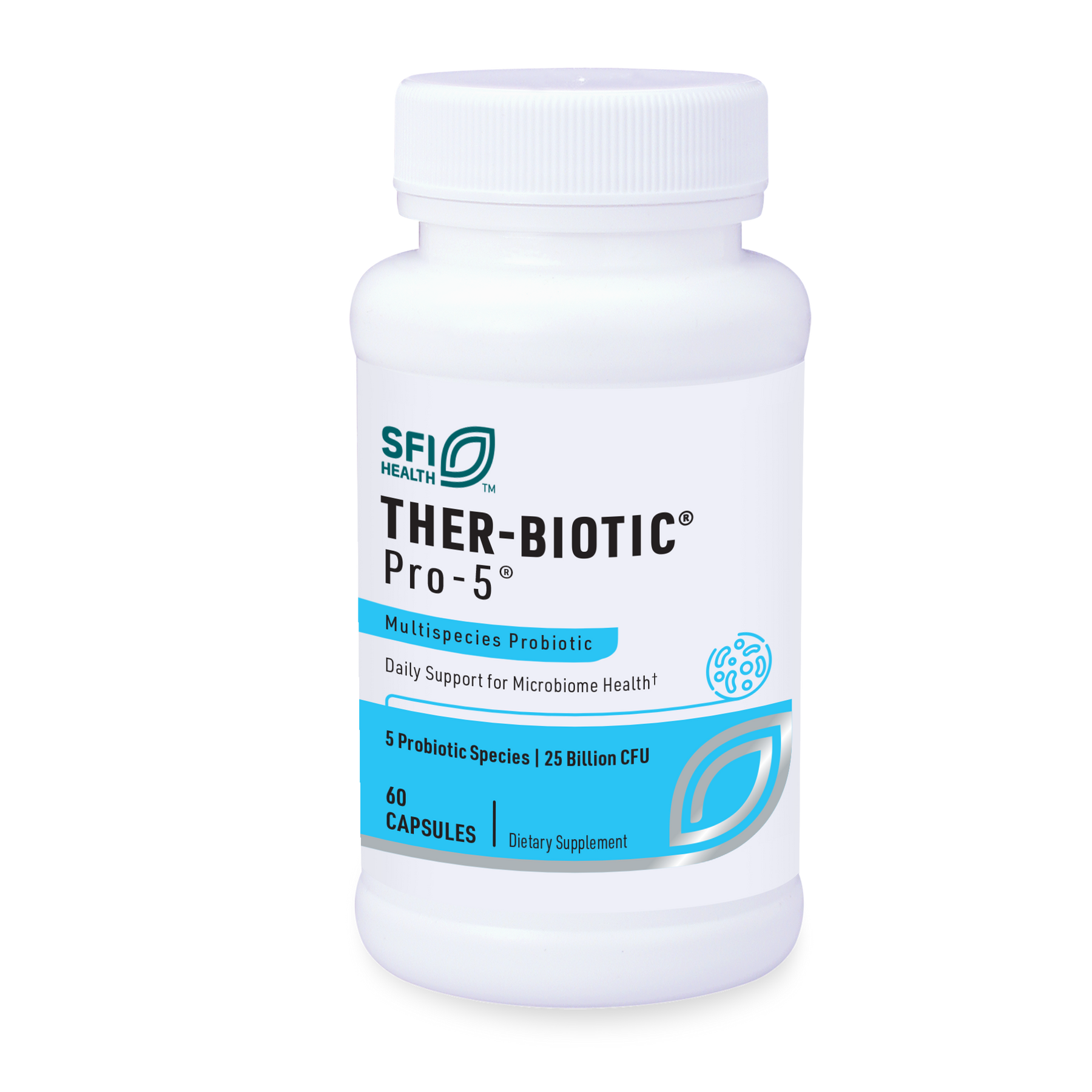 A high-CFU, hypoallergenic blend of 5 probiotic species, Ther-BioticĀ® Pro-5Ā® is designed for individuals who need a high degree of support to build and balance beneficial intestinal microbiota.Ā The 5 species in this formulationāLactobacillus rhamnosus, Lactobacillus acidophilus, Bifidobacterium bifidum, Streptococcus thermophilus,Ā andĀ Lactobacillus bulgaricusāwork together to effectively increase colonization of the microorganisms in both the small intestine and the colon.Ā The transient and colonizing species in this combination have a high tolerance to stomach acid and bile, which is important for maintaining viability in the intestinal environment. Ther-BioticĀ® Pro-5Ā® is an excellent, cost-effective option for supplementation with powerful amounts of primary, broad-acting resident and colonizing probiotic species complemented by two transient species that compete against undesirable bacteria and yeast.ā Ā Supplies 25 billion CFUs per capsule.