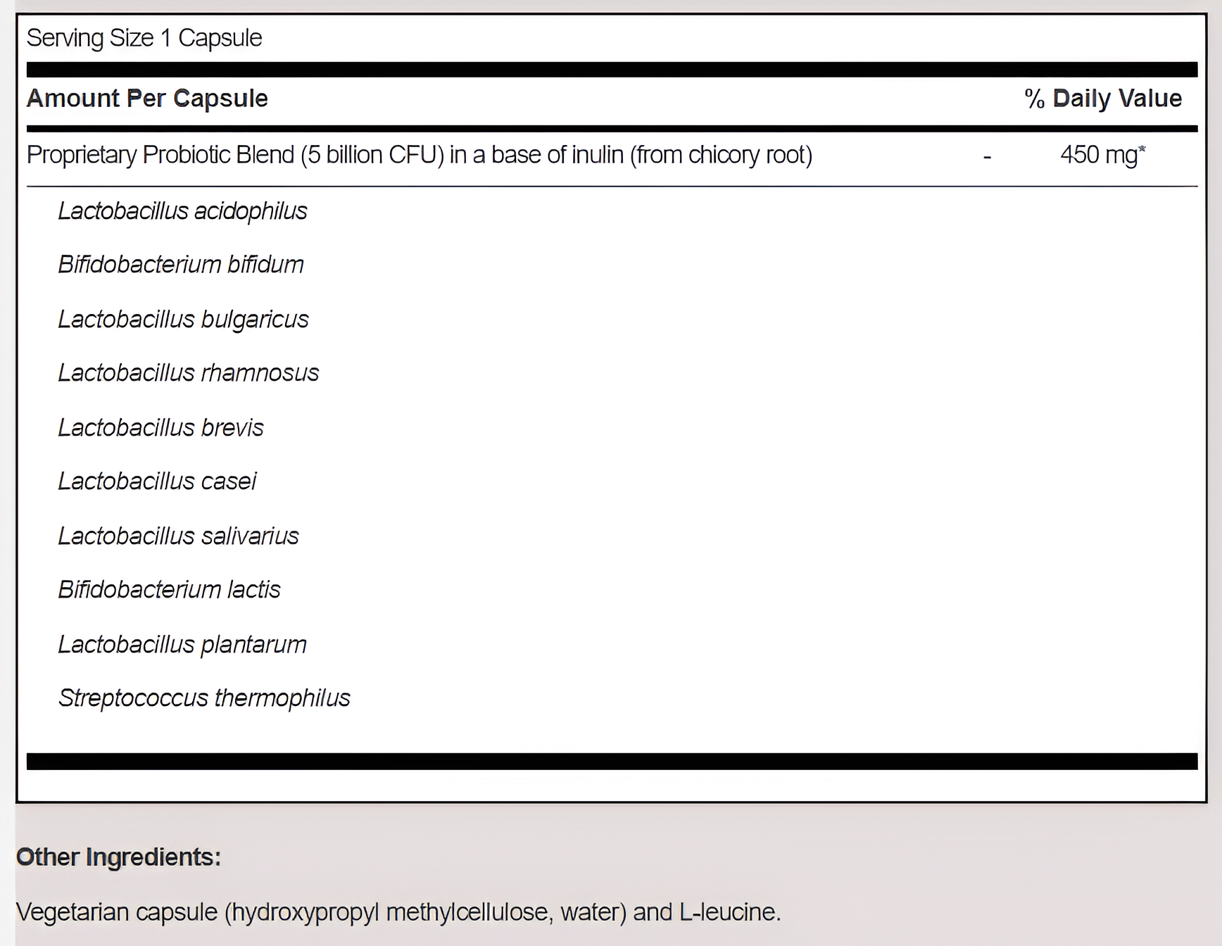 Ther-Biotic® Vital-10® provides a synergistic blend of indigenous, essential colonizing, and beneficial transient probiotic microorganisms. The Lactobacillus species normally predominate in the small intestine while the Bifidobacterium species are important for the colon. Ther-Biotic® Vital-10® supplies beneficial probiotic organisms generally not present in modern, highly processed foods together with indigenous species whose numbers decline with age, medication, and stress. Two transient yogurt starter species with long histories of health benefits are blended into the formulation. Together they maintain a healthy, balanced intestinal microbiota, promote normal gastrointestinal function, synthesize B vitamins and vitamin K, facilitate nutrient and mineral absorption, and support normal intestinal and systemic immune functions.