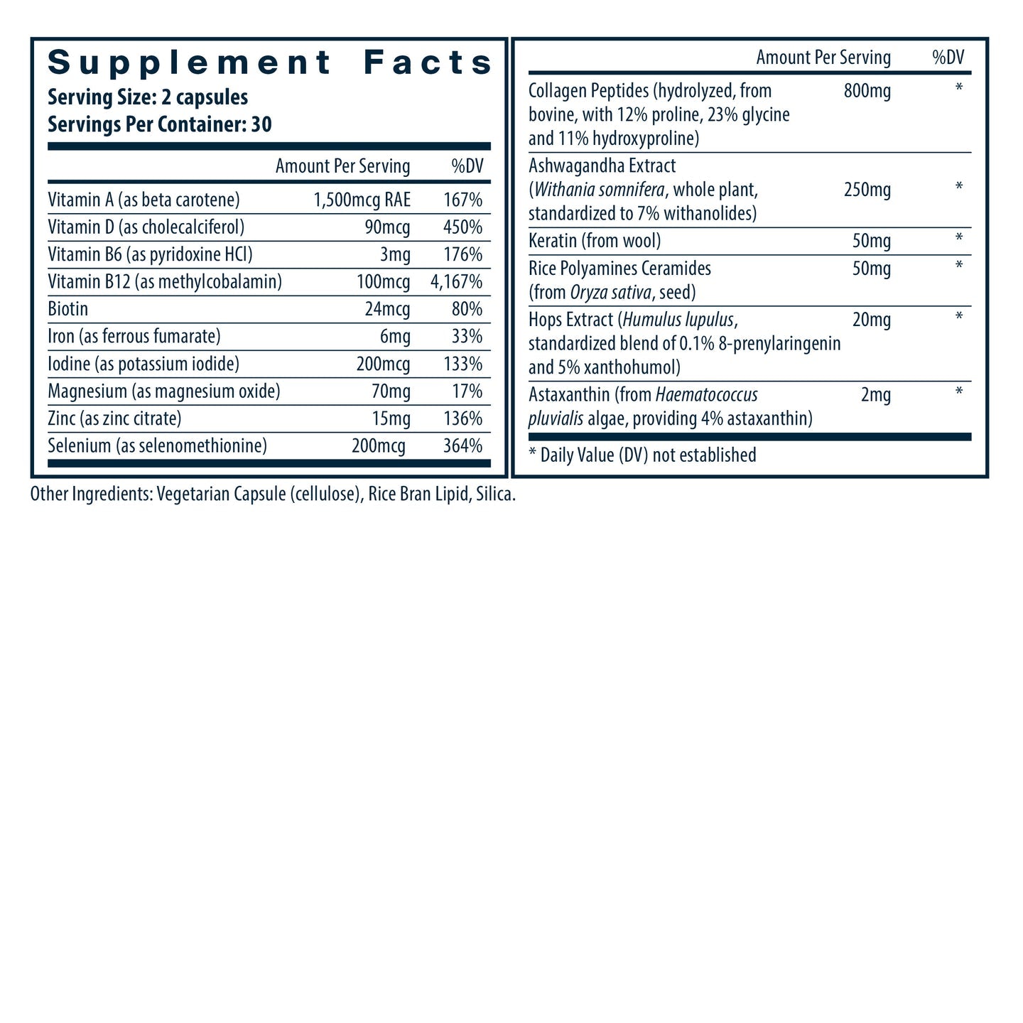 • Keratin supports hair shaft structure, strength, and resilience, while biotin, B vitamins, zinc, selenium, vitamin D, and iron support keratin synthesis, scalp circulation, and nutrient delivery to follicles(11,12)