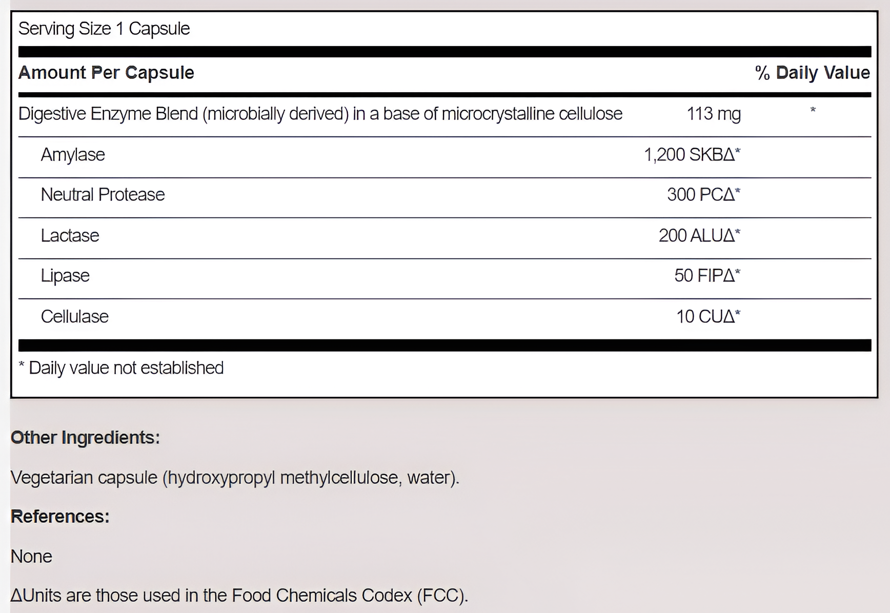 Inadequate digestive enzymes—amylase, lactase, lipase, cellulase, and neutral protease—can have an impact on digestive function, leading to occasional bloating, flatulence, or gastrointestinal discomfort. Each enzyme in Digestive Enzymes has a specific role to play that ultimately can help the body better absorb nutrients from food and supplements.