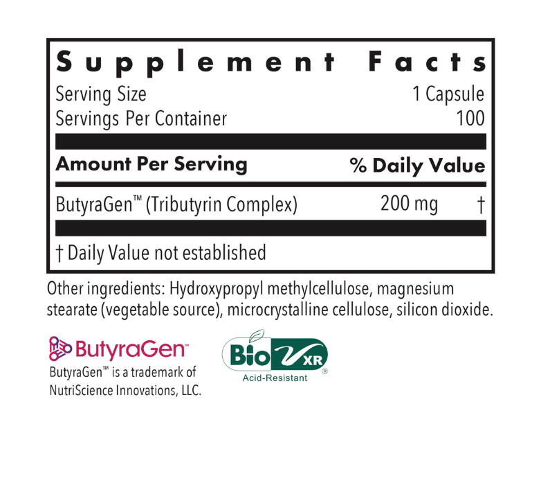 A source of butyric acid from the salts of calcium and magnesium. This short chain fatty acid is produced in the body by certain probiotic bacteria.* Now in delayed release DRcaps™.