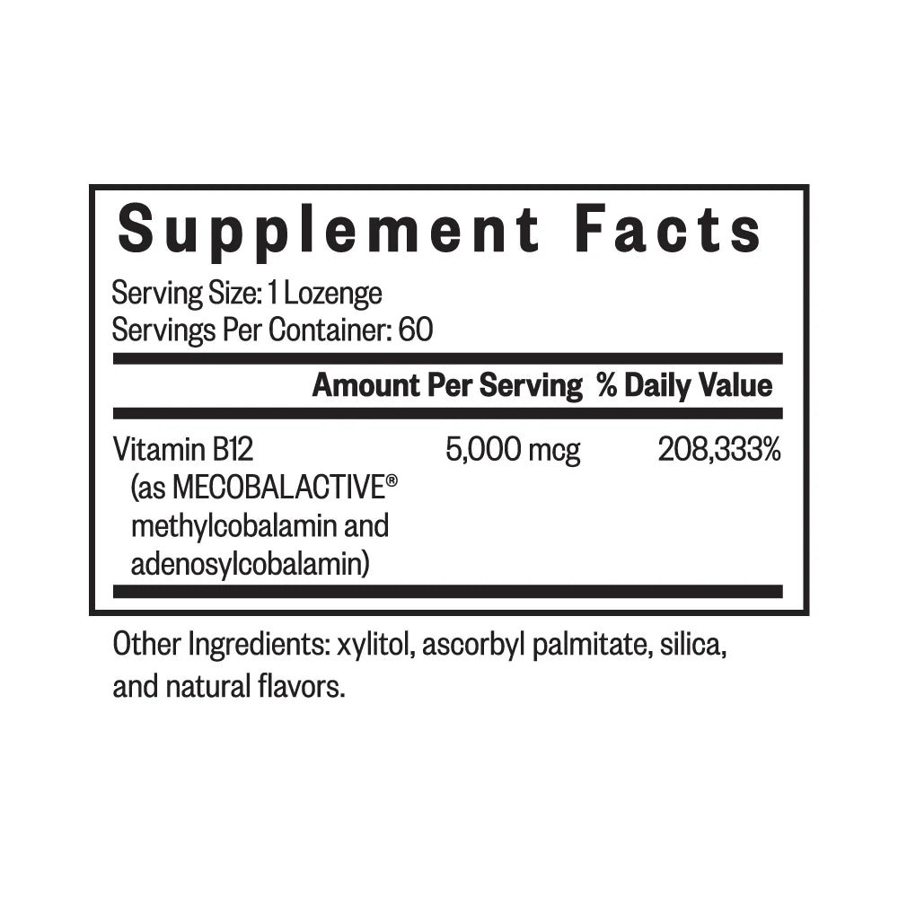 Methyl B12 5000 provides a potent dose of bioavailable vitamin B12 in a delicious, well-absorbed lozenge. Each serving contains a 5,000 mcg mixture of methylcobalamin and adenosylcobalamin.