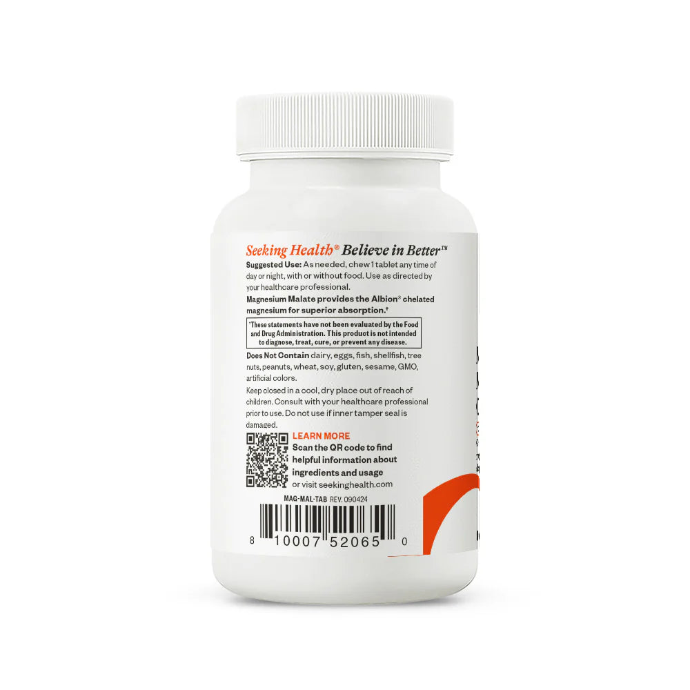 Magnesium Malate Chewable by Seeking Health contains 100 mg of magnesium as dimagnesium malate in an easy-to-deliver chewable tablet.Ā This form of magnesium both provides a relatively high elemental concentration of magnesium and contains malic acid, a compound naturally present in fruits such as apples, which plays a role in the Krebsā Cycle and healthyĀ energyĀ production.