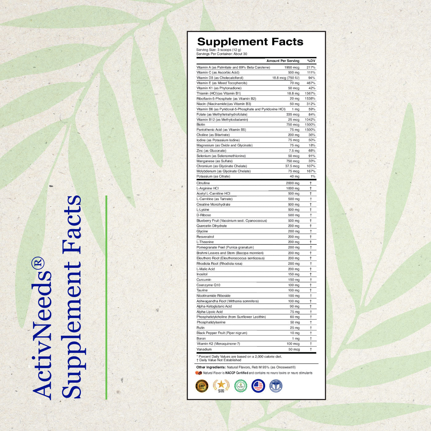 Ingredients: There are 55 active ingredients in ActivNeeds, all of which are natural nutritional supplements including vitamins, minerals, and activated cofactors. In addition, many ingredients are whole plants//herbs and extracts thereof. There are no ingredients at or near dosages considered to be toxic. There are no inactive ingredients other than the HACCP-certified, all-natural flavoring Onosweet from sugarcane, which is not a neurotoxin or neuro stimulant. ActivNeeds is considered to be fully vegan; vitamin D is extracted from live sheep wool. This product is also free of gluten, casein/milk, tree nuts, peanuts, soy, egg, fish, and shellfish.