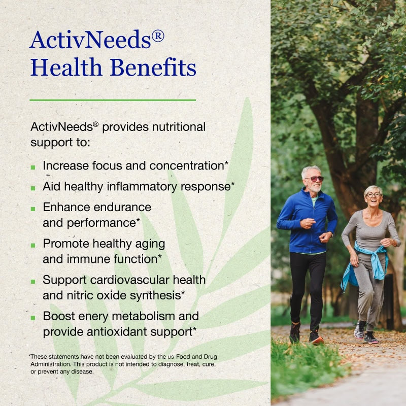 ActivNeeds is a combination of 55 active ingredients designed to generate more cellular energy from the mitochondria – the powerhouses of the cell. ActivNeeds also is designed to produce nitric oxide for improved cardiovascular health, increase muscle endurance, recover faster from exertion, increase mental focus (nootropics), boost immune responses, and slow aging.